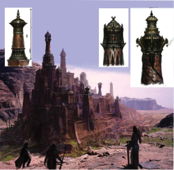 Illustrasjonen viser tegninger av landskap, bygninger og bygningsdetaljer fra dataspillet Age of Conan. Hyborian adventures . Spillet er utviklet av det norske selskapet Funcom.