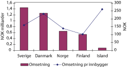 Man kan også lese ut fra figuren at Island konsumerer mest dataspill per innbygger. På Island er gjennomsnittsomsetningen per innbygger om lag 260 kroner. Sverige og Danmark konsumerer om lag like mye per innbygger.