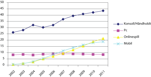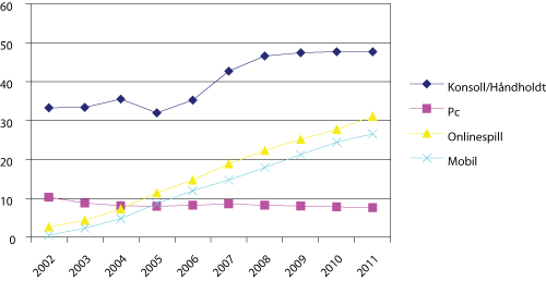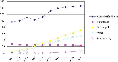 Figur 4.7 Omsetningsutvikling internasjonalt for spill på ulike plattformer 2002–2011.
