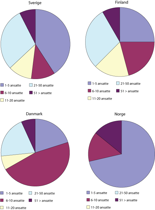 Figur 4.3 gir et bilde av markedsstrukturen i de nordiske landene. Ettersom markedene ikke er spesielt store, er datagrunnlaget noe begrenset. Likevel gir tallene tydelige indikasjoner på at Norge skiller seg ut; i Norge har drøye to tredjedeler av selskapene kun fem ansatte eller færre. I tillegg har Norge ingen mellomstore selskaper. Dette gir uttrykk for en lite moden bransje. Til sammenligning har de andre nordiske landene en mer jevn spredning, dvs. selskaper i alle størrelser.