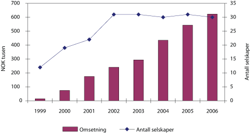 Den svenske spillindustrien har vært preget av oppkjøp og fusjoner, særlig i perioden 2000–2003. Figur 4.4 viser den historiske omsetningen til selskaper som fremdeles er i drift. I 2006 var det 30 spillutviklingsselskaper, som til sammen omsatte for 524 mill. norske kroner og sysselsatte 691 personer.