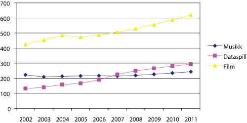Figur 4.5 Omsetning av musikk, dataspill og film i det internasjonale markedet 2002–2011.
