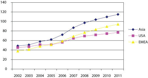 Figur 4.9 Asia Pacific. Utviklingen av de ulike plattformene 2002–2011.