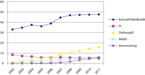 Figur 4.7 viser historiske tall og antatt utvikling i omsetning av spill internasjonalt på ulike plattformer i perioden 2002–2011. I tillegg til de ulike teknologiske plattformene er det tatt med tall for utviklingen innen annonsering i spill.