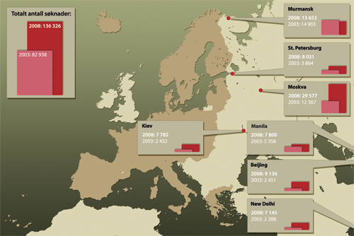 Utlendingsforvaltningen er viktig for dem som ønsker seg til Norge, men også for næringsliv, turisme, forskning og kulturliv, og for de mange nordmenn med innvandrerbakgrunn som får besøk av foreldre, slekt og venner. Den 1.1.2008 hadde Norge 638 000 innbyggere med slik bakgrunn gjennom eget eller minst en av foreldrenes fødeland. Av disse har 57 prosent norsk statsborgerskap. Denne delen av befolkningen vil bli større i framtiden. Dette gir økende oppgaver til utlendingsforvaltningen, ikke minst til norske ambassader og generalkonsulater (jf. del III, kap. 21). Det har særlig vært en betydelig og ressurskrevende vekst i antall visumsøknader.