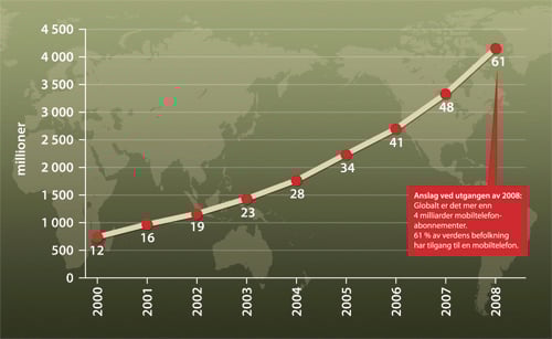 Figur 9.1 Mobiltelefonbrukere i verden. Vekst 2000 – 2008