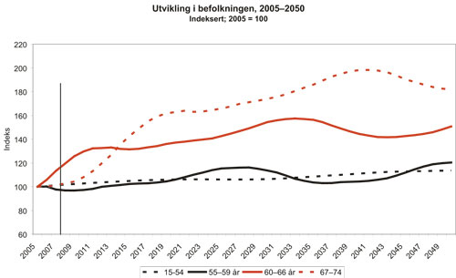 Gjennomsnittsalderen til pensjonistene øker i takt med økt levealder. Fram til 2050 vil andelen av befolkningen som er blant de aller eldste, det vil si 90 år og over, bli tredoblet fra 2005. Mens det var omtrent halvparten så mange personer i aldersgruppen 70 år og over sammenliknet med gruppen 15 år og yngre i 2005, vil det ifølge middelalternativet være like mange personer i begge aldersgruppene i 2045. Det store antallet eldre fører til at ressursbehovet innen helse, pleie og omsorgssektoren vil øke sterkt og kan innebære at arbeidskraft må flyttes hit fra andre områder. En stor del av overflyttingen vil kunne skje gjennom de unges utdanningsvalg.
