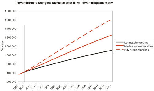 Innvandrerbefolkningen anslås å ville vokse sterkt, fra 365 000 i 2005 til mellom 900 000 og 1,6 millioner i 2050. Anslaget avhenger av forutsetninger om nettoinnvandringen, gitt en fruktbarhet og levealder som i middelalternativet, jf. figur 2.2.
