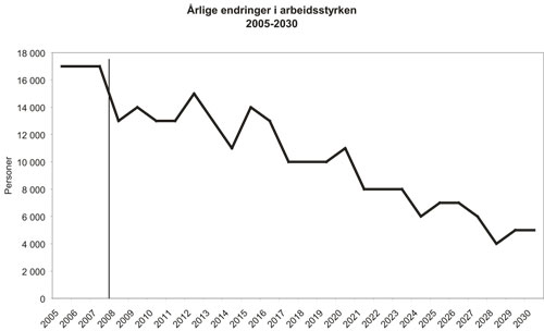 I perioden 2005 til 2030 ventes et fall i den årlige veksten i arbeidsstyrken fra 17 000 personer i starten av perioden til om lag 5000 personer i 2030, jf. figur 2.3.