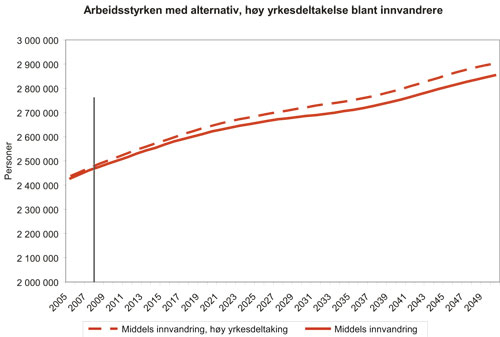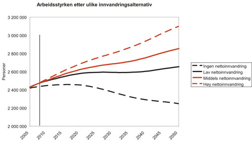 Alternative forutsetninger om nettoinnvandringens størrelse gir utslag i arbeidsstyrken, jf. figur 2.4. I lavalternativets forutsetning om en årlig nettoinnvandring på 9000 personer i året, blir arbeidsstyrken 200 000 personer lavere i 2050 enn i middelalternativet med nettoinnvandring på 16 000 personer i året. Med høyalternativets forutsetning om en nettoinnvandring på 24 000 personer i året, blir arbeidsstyrken i 2050 nærmere 250 000 høyere enn ved middels innvandring. Hvis innvandringen hadde stoppet opp fra og med 2005 ville arbeidsstyrken avtatt allerede fra 2017, og den ville i 2050 blitt om lag 600 000 personer lavere enn i middelalternativet. Det viser at innvandring har stor betydning for potensielt framtidig arbeidstilbud.