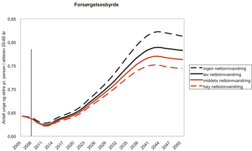 Uavhengig av hvilke forutsetninger som legges til grunn om årlig nettoinnvandring, vil gjennomsnittsalderen i befolkningen øke og forsørgelsesbyrden tilta i store deler av perioden fram til 2050, jf. figur 2.7. Omfanget av årlig nettoinnvandring påvirker forsørgelsesbyrden noe: I middelalternativet vil forsørgelsesbyrden øke med 19 pst. fra 2005 til 2050 (fra 0,64 til 0,76). På grunn av at innvandrerne har lavere gjennomsnittsalder vil innvandring bidra til å dempe økningen i forsørgelsesbyrden. I alternativet med høy innvandring vil for eksempel forsørgelsesbyrden øke med 16 pst. i samme periode, dvs. tre prosentpoeng mindre enn i middelalternativet. Ettersom innvandrerne også blir eldre, vil dette ikke være en permanent dempning av forsørgelsesbyrden.