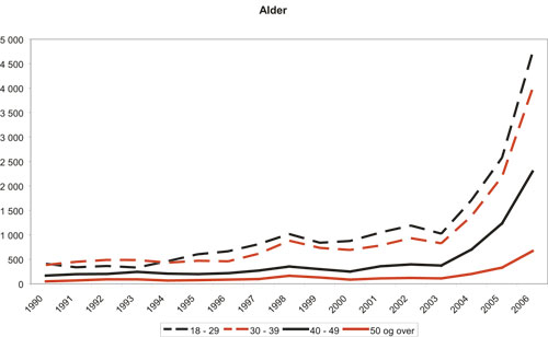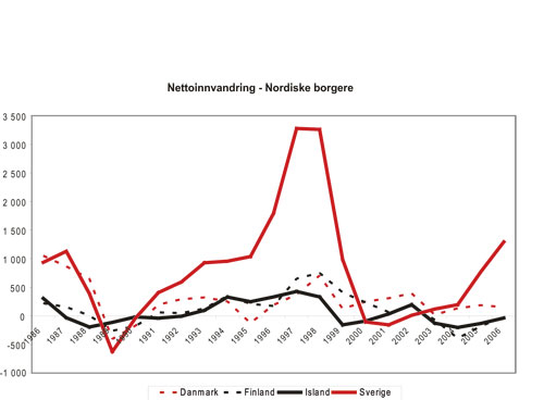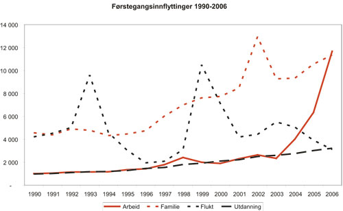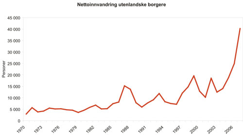 I perioden 1985 – 1995 var nettoinnvandringen til Norge i gjennomsnitt vel 8000 personer pr. år. Nettoinnvandringen har steget sterkt de siste årene. I perioden 1995 – 2005 var nettoinnvandringen på om lag 13 000, i 2006 var den 23 700, og i 2007 var den steget til 39 700. Endringer i nettoinnvandringen må blant annet ses i sammenheng med tilstrømningen av asylsøkere og familiegjenforente, men konjunkturutviklingen har også vært viktig. Den kraftige økningen i arbeidsinnvandringen siden 2003 har vært drevet av sterk etterspørsel etter arbeidskraft.