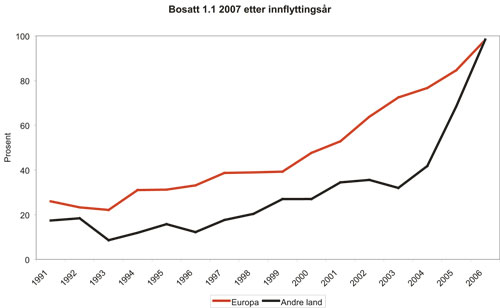 SSB har fulgt arbeidsinnvandrerne som flyttet til Norge i 2004, dvs. i nåværende høykonjunktur, og sett på hvor mange som ikke lenger er bosatt her to til tre år senere. Blant personer fra nye EU-land som flyttet til Norge i andre halvdel av 2004 var 22 pst. ikke lenger bosatt i Norge pr. 1. januar 2007, mens det blant personer fra gamle EU-land var en tilsvarende andel på 41 pst. Blant personer fra andre land var 17 pst. ikke lenger bosatt 1. januar 2007. Disse tallene er påvirket av innvandringsårsak, mulighetene i arbeidsmarkedet og personlige forhold. Store forskjeller i levestandard og lønnsnivå mellom Norge og de nye EU-landene trekker i retning av at mange fra disse landene vil kunne ha et mer langsiktig perspektiv på å bo i Norge, enn personer fra land med mer lik levestandard.