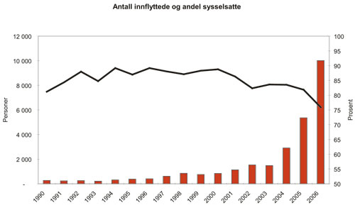 Samtidig som sysselsettingen har vokst, har også befolkningen i yrkesaktiv alder økt og andelen sysselsatte gått opp. En del av sysselsettingsøkningen skyldes større permanent nettoinnvandring til Norge og et økt antall sysselsatte på korttidsopphold. Statistisk sentralbyrå (SSB) har beregnet at andelen av sysselsettingsveksten som kan tilskrives arbeidsinnvandring, kan anslås til 15 – 25 pst. i 2006. Foreløpig informasjon kan tilsi at arbeidsinnvandringen stod for 25 – 30 pst. av sysselsettingsveksten i 2007.