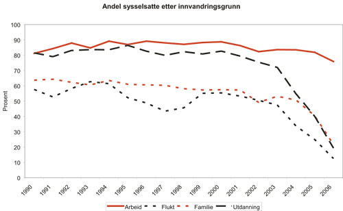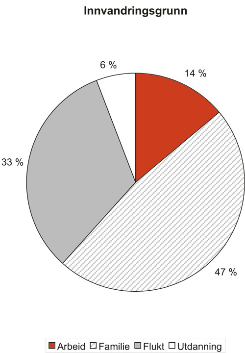 Framskrivningene tar ikke hensyn til eventuelle endringer i sammensetningen av innvandrerne og årsaken til at de kom til Norge. Arbeidsinnvandrerne utgjør bare en del av den samlede innvandrerbefolkningen, men både andelen og antallet arbeidsinnvandrere har økt betydelig de siste årene, jf. kapittel 3. Statistikk over varighet av bosetting viser betydelig variasjon etter oppholdsgrunnlag. Arbeidsinnvandrere har gjennomgående vesentlig lavere andel som blir permanent boende, enn for eksempel flyktninger og familiegjenforente til disse. Omfanget av arbeidsinnvandringen betyr derfor mindre for de langsiktige framskrivningene av innvandrerbefolkningen enn de andre innvandringsårsakene.