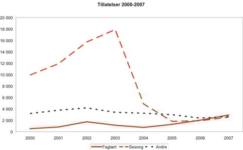 En liten andel av sesongarbeidstillatelsene gjelder sesongarbeid i andre næringer enn landbruket.