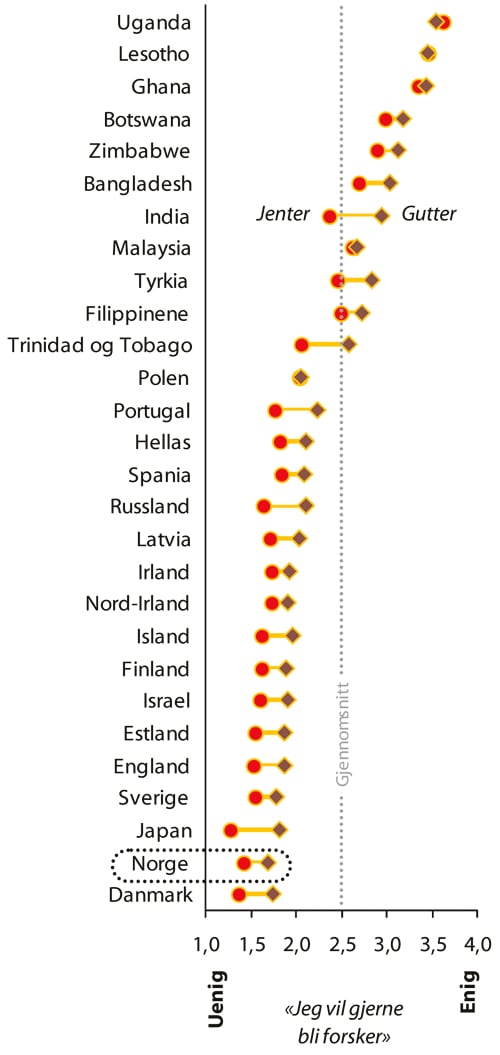 Det internasjonale ROSE-prosjektet har kartlagt ungdommers holdninger til realfagene, og viser at norske 15-åringer synes at naturvitenskap og teknologi er viktig for samfunnet 4 . Samtidig misliker de sterkt å ha disse fagene på skolen, og nesten ingen 15-åringer kan tenke seg å jobbe med naturvitenskap eller teknologi senere i livet. Problemet består særlig i at fagene oppleves som vanskelige, og dermed fristende å velge bort. Figur 8.1 viser at det er en systematisk forskjell mellom rike og fattige land, og mellom gutter og jenter, når det gjelder interesse for en fremtidig forskerkarriere innenfor disse fagene.