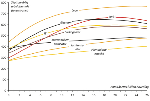 Kilde: Hægeland og Møen (2005): Forskerrekruttering og opptrappingsplanen. Estimerte lønnsprofiler for utvalgte utdanninger på master- og doktorgradsnivå. Manuskript, Statistisk sentralbyrå.
