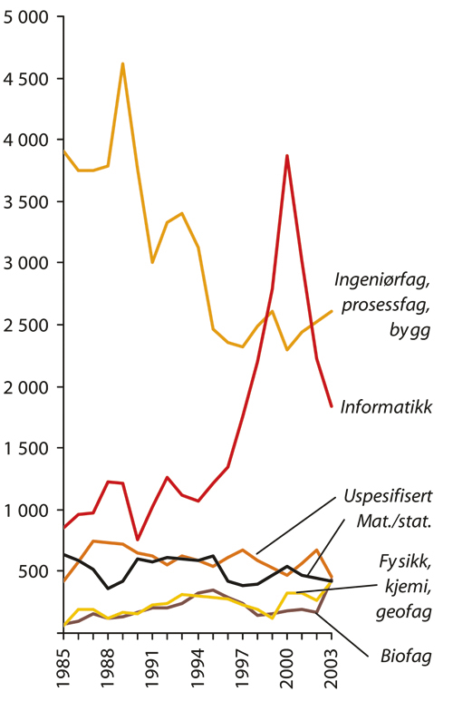 Det har vært en svak, men langvarig nedgang i andelen ungdommer som tar fordypning i realfag i videregående opplæring – fra nærmere 30 prosent i 80-årene til 20 prosent i 2003. Antallet varierer med størrelsen på fødselskullene, men er nå lavere enn før (under 12 000 per år). Rekruttering til høyere utdanning innenfor realfagene totalt har ligget konstant på rundt 6000 studenter per år de siste 20 årene, mens rekruttering til universitets- og høyskolestudier totalt er mer enn doblet (se figur 9.8). Selv om total rekruttering til realfagene har vært konstant, er det store forskjeller mellom de ulike fagområdene, se figur 8.3 6 . Innenfor teknologifagene har det vært sterk vekst i tilstrømningen til IT-fag, mens det har vært en vedvarende svikt i rekrutteringen til ingeniørfagene. Veksten i søkningen til IT-fagene stoppet opp i 2001, men det forventes at søkningen vil ta seg opp igjen når arbeidsmarkedet bedres.