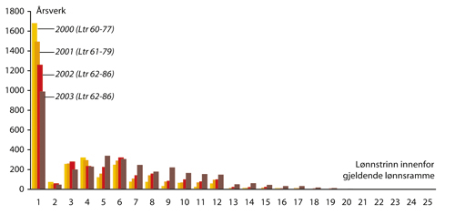Figur 8.4 Bruk av lønnsspennet, 2000–2003. Antall årsverk per trinn.
