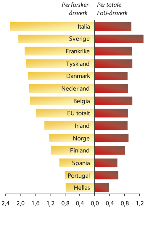 Flat lønnsstruktur, lite støttepersonell, samt en relativt lav andel utstyrskrevende forskning (naturvitenskap og teknologi) gjør at utgiftene per forskerårsverk er lavere i Norge enn i de fleste andre europeiske land, se figur 8.5. Samtidig viser figuren at Norge ligger mer på linje med andre land når det gjelder utgifter til totale forskerårsverk. Dette må bety at det norske forskerpersonalet uten forskerutdanning kommer relativt sett bedre ut enn de som har slik utdanning.