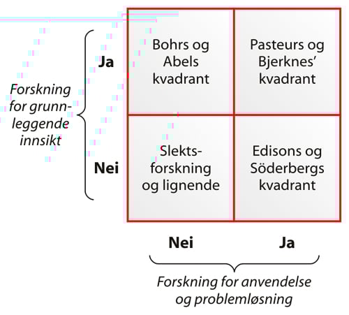 En annen forsker, Donald Stokes 2 , har også kritisert den forenklede inndelingen i henholdsvis grunnforskning og anvendt forskning. Stokes mener at forskning bedre kan forstås dersom man samlet ser på både hvorvidt den sikter mot å bidra til grunnleggende innsikt, og hvorvidt den søker løsning på praktiske problemer, jf. boks 9.2.