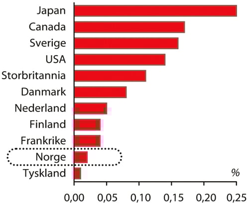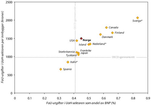 Norsk universitets- og høyskolesektor rangerte i 2002 som nummer åtte av OECD-landene, målt i forskningsutgifter som andel av bruttonasjonalproduktet. Denne andelen økte fra 0,45 prosent i 2002 til 0,48 prosent i 2003. Ser vi på realveksten i sektorens forskningsutgifter fra 1995, lå Norge litt under gjennomsnittlig vekst for OECD-landene frem til 2001. I de to påfølgende årene har veksten til forskningen ved universitetene vært på nesten 14 prosent, noe som er høyere enn gjennomsnittet i OECD. Statistikk for hele OECD-området foreligger imidlertid ikke etter 2002. Enkelte land satset i perioden fra 2001 til 2003 enda sterkere på forskning i universitets- og høyskolesektoren, for eksempel USA, Finland og Danmark.