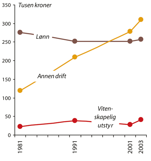 Driftsutgifter til forskning omfatter lønn og sosiale utgifter (arbeidsgiveravgift og pensjon) og andre driftsutgifter (forbruks- og laboratoriemateriell, bøker, PC-er, tidsskrifter, kurs, reiser og i tillegg overhead- eller infrastrukturutgifter, for eksempel kostnader knyttet til husleie, fyring og administrasjon). Her inngår både basisfinansiering og ekstern finansiering. Fra 2001 til 2003 var den eksterne finansieringen spesielt høy (21 prosent). Ser vi på utviklingen for de ulike utgiftsartene fra 1981 til 2003, har det vært en betydelig realvekst i kategorien andre driftsutgifter, mens økningen i lønn og sosiale utgifter har vært mer beskjeden. Mens andre driftsutgifter økte mer i åttiårene enn i nittiårene, var det motsatt for utgifter til lønn. Samlet for universiteter og vitenskapelige høyskoler utgjorde andre driftsutgifter 37 prosent av totale driftsutgifter til forskning i 1981, 45 prosent i 2001 og 51 prosent i 2003. Til tross for denne utviklingen er det svært mange forskere som rapporterer om store vanskeligheter med å få dekket mindre driftsutgifter. I kap. 9.3 utdypes denne problemstillingen.