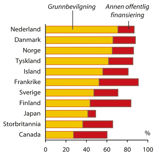 Sammenlignet med de fleste andre land har Norge en relativt høy andel bevilgninger direkte til universiteter og høyskoler. Tall fra 2001 viser at 62 prosent av institusjonenes forsknings- og utviklingsutgifter ble finansiert over grunnbudsjettet. 7 Tilsvarende andeler for Sverige og Finland var henholdsvis 40 og 50 prosent 8 . I perioden etter 2001 har begge disse landene gått i retning av økt forskningsrådsfinansiering. I Norge har veksten i de direkte forskningsbevilgningene til institusjonene vært klart større enn veksten til grunnforskning gjennom Forskningsrådet. Dette har vært en bevisst prioritering, ikke minst i lys av de store omstillingene i universitets- og høyskolesektoren de senere årene.