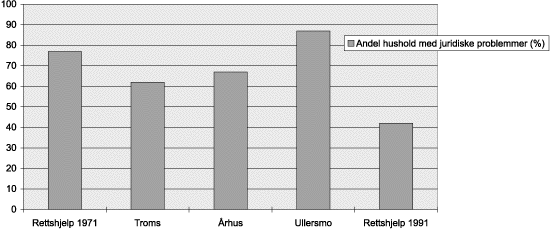 Århusundersøkelsen viser rettshjelpsbehovet blant unge beboere i en moderne drabantby, mens undersøkelsen fra Ullersmo viser rettshjelpsbehovene til en institusjonsplassert gruppe. Sistnevnte utvalg befant seg i en vanskelig livssituasjon og hadde naturlig nok et høyere rettshjelpsbehov enn gjennomsnittsbefolkningen.
