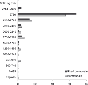 Figur 3.2 og 3.3 viser hvordan barn med heltidsplass uten moderasjoner fordeler seg på ulike satser i henholdsvis kommunale og ikke-kommunale barnehager.
