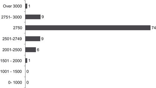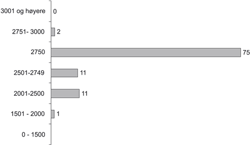 Figur 3.2 Satser for heltidsplass uten moderasjoner i kommunale barnehager i kroner per måned. Oktober 2004. Prosent av kommunene fordelt ut fra hva som er høyeste sats i den enkelte kommune.1