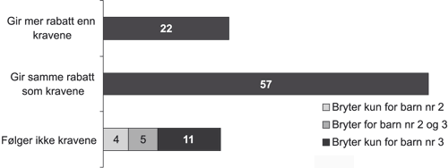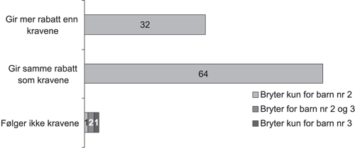 Som det framgår av figurene 3.4 og 3.5 overholder nesten alle kommuner kravene i forskriften. Også i de ikke-kommunale barnehagene er det et overveiende flertall som oppfyller forskriftens krav. En betydelig andel av både kommunale og ikke-kommunale barnehager gir en høyere reduksjon i søskenmoderasjonen enn forskriften krever.
