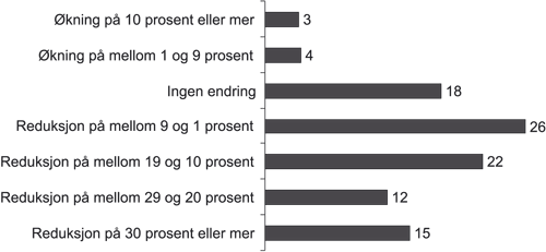 Figur 3.6 viser endringer i laveste heltidssats i kommunale barnehager. Tallene inkluderer alle kommuner, uavhengig av om de har eller har hatt ordninger med inntektsgradering. I kommuner som ikke har inntektsgradering vil laveste sats være det samme som høyeste sats, men i disse kommunene vil også de med laveste betalingsevne nyte godt av den generelle reduksjonen i foreldrebetalingen. Som det framgår av figuren, har nesten halvparten av kommunene ikke gjort endringer i laveste betalingssats. Noen flere kommuner har økt laveste betalingssats enn andelen som har redusert satsen.