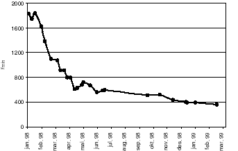 Effekten av ettertettingen avtok utover året i 1998 slik at redusert innlekkasje pr. investert krone ble mindre etter hvert.
