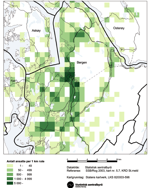 Når det gjelder vekst i antall arbeidstakere (i perioden 1995–2000), har senterkommunene gjennomgående hatt sterk vekst i forhold til omlandskommunene. Ettersom det motsatte er tilfellet for befolkningsveksten, medfører dette økte avstander mellom boliger og arbeidsplasser. Alle storbyregionene med unntak av Tromsø har imidlertid også omlandskommuner med vekst i antall arbeidstakere. Denne veksten følger et mønster som ligner befolkningsveksten, men enkelte omlandskommuner bærer preg av å være boligkommuner. Både bosettingen og lokaliseringen av arbeidsplasser er hovedsakelig tettest i de sentrale områder. Men deler av bosettingen blir spredd over et større område, slik at mange av dem som bor i omlandet må pendle langt til byen.