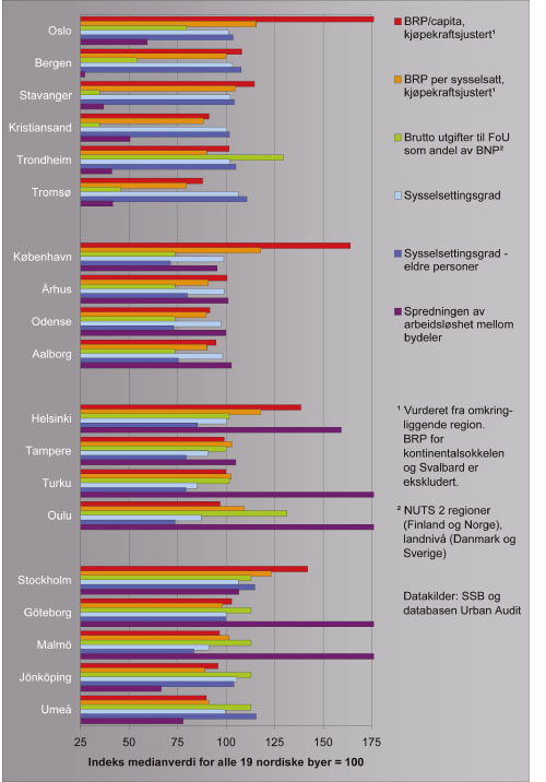 Med disse forbeholdene ser vi i figur 9.2 at de fleste norske byene klarer seg meget godt i en nordisk sammenlikning av konkurranseforutsetningene slik de er definert i Lisboa-indikatorene. Etter Stockholm kommer Trondheim, Oslo, Bergen og Stavanger øverst på den samlede rankingen, fulgt av København og Helsingfors. Tromsø plasserer seg i mellomgruppen på delt 10. plass, mens Kristiansand havner tredje sist på 17. plass, med bare Odense og Åbo bakom seg.