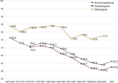 Ved kommunestyrevalet i 2007 deltok 61,2 prosent i kommunestyrevalet, medan 57,5 prosent røysta ved fylkestingsvalet. Dette var ein auke samanlikna med dei to førre lokalvala i 2003 og 1999. Som figur 5.1 viser, hadde då deltakinga i lokalval falle i seks val på rad, sidan 1979. Ved kommunestyrevalet i 2007 var deltakinga om lag 12 prosentpoeng lågare enn ved kommunestyrevalet i 1979, medan deltakinga ved fylkestingsvalet fall med knapt 14 prosentpoeng mellom desse åra. Også ved stortingsval har deltakinga gått attende, men her er tilbakegangen mindre og ikkje like eintydig. Ved stortingsvalet i 1981 var deltakinga om lag 6 prosentpoeng høgare enn ved stortingsvalet i 2005. Lokaldemokratikommisjonen viser at skilnaden i deltakinga mellom lokalval og stortingsval tok til å auka frå midten av 1980-talet, men det er særleg ved dei siste vala at skilnaden har vorte merkbart større.