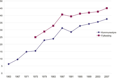 Men det er store ulikskapar mellom kommunane. Etter valet i 2007 har meir enn kvart femte kommunestyre under 30 prosent kvinner. I fylkestinga utgjer kvinnene i gjennomsnitt 45 prosent. Frå og med 1975 har det vore direkte val av fylkestingsrepresentantar. Sidan dess har det støtt vore relativt fleire kvinnelege representantar på fylkestinga enn i kommunestyra.