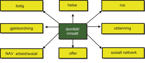 Svært mange innsatte og domfelte er før dom klienter hos en eller flere offentlige etater. Mange innsatte vil også være avhengig av disse tjenestene etter løslatelse. Under straffegjennomføring er de vanligvis mer motiverte enn før for å gjøre noe med sitt eget liv, de er tilgjengelige og de er ikke ruset. Straffegjennomføringen er derved et gunstig tidspunkt for å begynne rehabilitering og reintegrering tilbake til samfunnet.