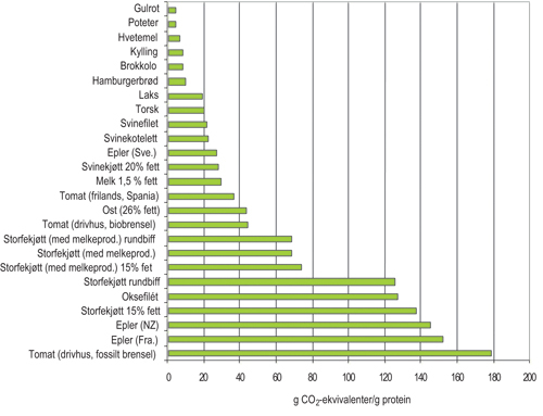 | Produktgrupper | Ressursbruk per tonn handelsvare (GJ) | Ressursbruk for produksjon av matvarer som inneholder 1 TJ omsettelig energi for ulike produktgrupper (TJ) | Ressursbruk per kg fordøyelig protein (MJ) |