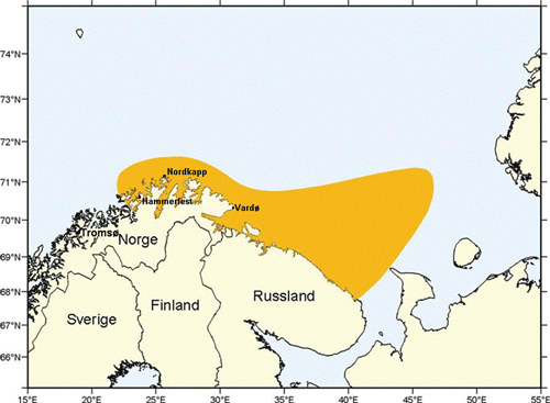 Figur 2.1 Utbredelse av rød kongekrabbe, Paralithodes camtschaticus (gule felter)