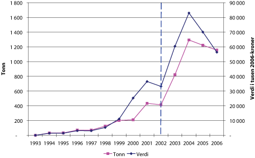 Den stiplede linjen i figur 2.3 og 2.4 indikerer starten på den kommersielle fangsten. De siste årene med bare forskningsfangst hadde fangstverdien en kraftig økning og var i 2001 kommet opp i 36,5 millioner 2006-kroner av en kvote på 100 000 krabber. Som figuren viser kan det synes som om en foreløpig topp ble nådd i 2004, både når det gjelder fangstmengde (vekt) og -verdi. Nedgangen etter denne toppen har sin forklaring bl.a. gjennom redusert gjennomsnittsstørrelse på krabben og nedgang i oppnådde priser, jf. tabell 4.2. Økonomiske virkninger vil bli nærmere belyst i kapittel 4.