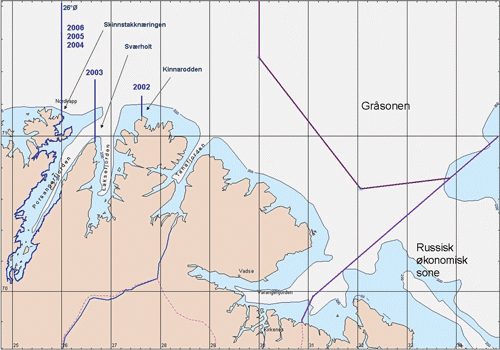 Området for kommersiell fangst av kongekrabbe ble utvidet etter hvert som bestanden spredde seg vestover til nye områder. På den 32. sesjon i Den blandete norsk-russiske fiskerikommisjon høsten 2003 ble det enighet om at Norge skulle innføre en vestgrense for norsk-russisk fellesforvaltning av kongekrabbe. Grensen ble satt på 26°østlig lengde ved Skinnstakknæringen på Magerøya, og slik at hele Porsangerfjorden ble øst for grensen (figur 2.2). Formålet med dette tiltaket var å begrense spredningen av kongekrabbe vest for denne grensen. Norge stod nå fritt til å iverksette de tiltak man mente var nødvendig og hensiktsmessig vest for grensen, dog under den forutsetning av at tiltakene ikke påvirket bestandsutviklingen i russisk sone.