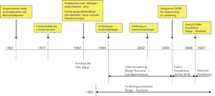 Nedenfor følger en illustrasjon over viktige hendelser i forvaltningen av kongekrabbe fra utsettelse på 1960-tallet og frem til i dag.