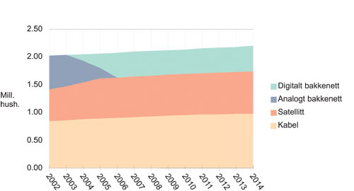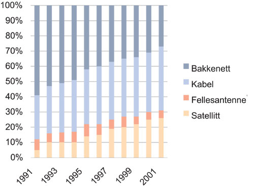 Utbredelsen av kabel og satellitt det seneste tiåret har skjedd på bekostning av bakkenettet hvor markedsandelen nå er på under 30 pst.