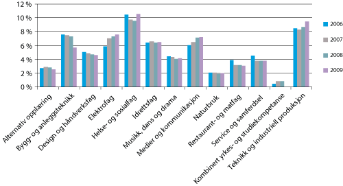 Figur 6.1 Andel søkere fordelt på yrkesfaglige utdanningsprogrammer, Vg1 2006–2009, prosent.