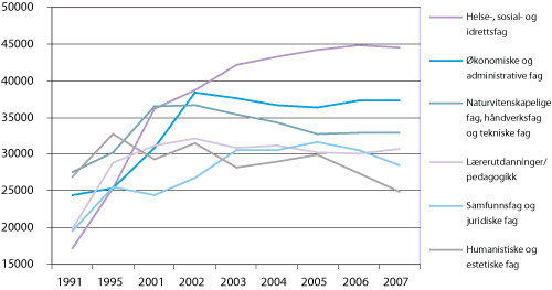 Innenfor høyere utdanning har det vært en betydelig økning i antall studenter fra 1991 til i dag på de fleste fagområdene. Figur 6.2 viser utviklingen i antall studenter fordelt på fagområde.