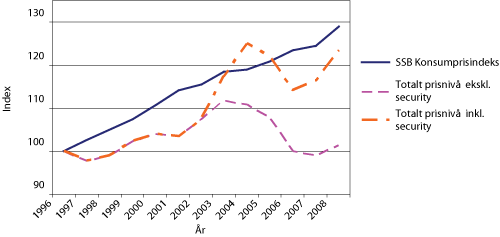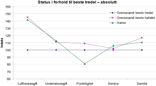 Prisutviklingen har vært tilfredsstillende innen lufthavntjenestene, men prisen for flysikringstjenesten har økt ut over målsettingen. Dette har bidratt til å svekke konkurransekraften i forhold til andre nordiske land. Den avgift som har økt klart sterkest de senere år er securityavgiften. Kostnadsøkningen her er relatert til nye myndighetskrav.