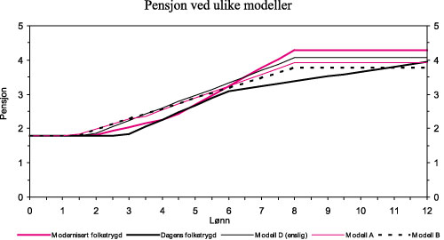 Tabell 1 viser sammenhengen mellom pensjon og inntekt i dagens folketrygd, modernisert folketrygd modell A, B og D etter 43 år med jevn inntekt. Tabellen og de øvrige beregningene fra Finansdepartementet viser at både modell A, B og D gir en bedre fordelingsprofil enn pensjonskommisjonens forslag til modernisert folketrygd.